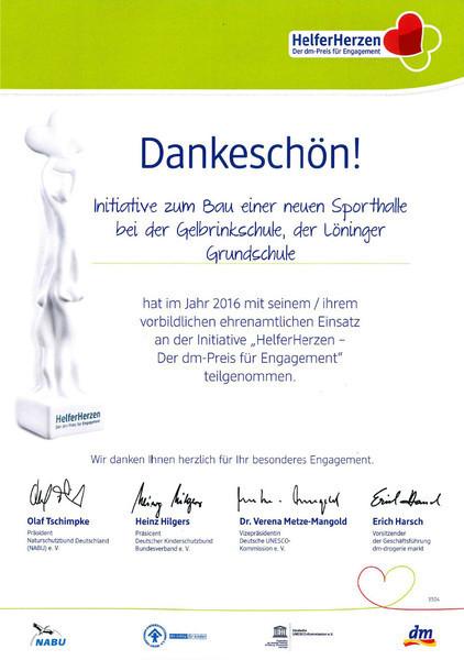 Die Aktion "HelferHerzen" hat sich bei der Initiative zum Bau einer neuen Sporthalle bei der Gelbrinkschule, der Löninger Grundschule, mit einer Dankeschön-Urkunde bedankt. Wir freuen uns sehr über diese Urkunde, auch wenn wir leider nicht zu den eigentlich Ausgezeichneten der diesjährigen Aktion gehören.