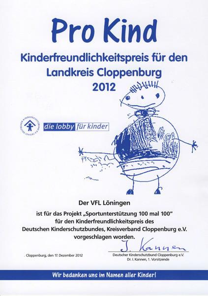 Gestern, am 17.12.2012, hat der Kinderschutzbund Cloppenburg im Kreishaus in Cloppenburg vor rund 100 Besuchern den Kinderfreundlichkeitspreis 2012 verliehen. Auch die Initiative "100x100" des VfL Löningen war in diesem Jahr für die Auszeichnung vorgeschlagen worden. Leider hat unsere VfL-Förderidee nicht den ersten Platz belegt, wir sind aber dennoch mit einer Urkunde und einem Präsent ausgezeichnet worden.