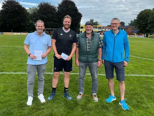 Beim letzten Heimspiel wurden in der Halbzeit die diesjährigen Gewinner unserer Kicktipprunde geehrt. Den ersten Platz mit 500€ sicherte sich Stefan Miller mit 431 Punkten, vor Michi Lampe und Andre Lanfermann. Bittere Pille für Michi: unser Kassenwart war über 80% der Saison auf Platz 1 und musste sich am letzten Spieltag, mit nur einem Punkt weniger unserem Altherren Spieler geschlagen geben. Immerhin - seinen Cousin Andre lässt er mit 414 Punkten deutlich hinter sich auf Platz 3.
