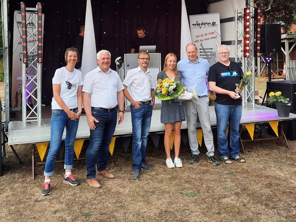Auch eine ganz besondere sportliche Leistung würdigten der 1.Vorsitzende Robert Koch und Bürgermeister Burkhard Sibbel und ehrten Carolin Hinrichs für die Teilnahme und Top 10 Platzierung bei der Weltmeisterschaft U20 der Leichtathletik im kolumbianischen Cali.