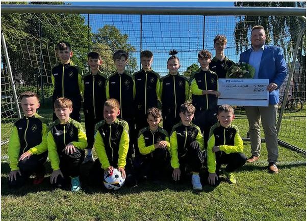 Bild der Übergabe der Anzüge mit Jannik Braun der Volksbank Löningen