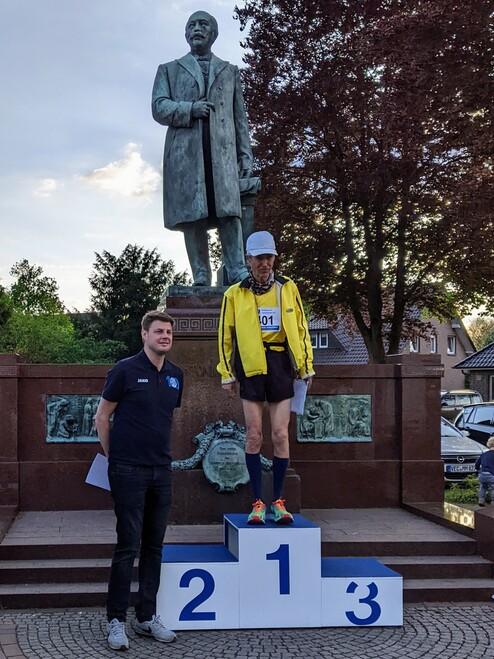 Die Straßenläufer des VfL Löningen sind aktuell vilerorts unterwegs. Am letzten Wochenende startete Jürgen Schmidt beim 19.Haselünner Altstadtlauf über 5 km. Es waren 3 Runden in der Altstadt zu absolvieren und die Strecke erweis sich aufgrund von vielen 90 Grad Ecken und Kopfsteinpflasterpassagen nicht unbedingt als rekordgeeignet. Jürgen Schmidt nach dem Rennen: " Mein Ziel war es, auf den bestenlistenfähigen 5 km meine Durchgangszeit aus Badbergen von 21:34 zu unterbieten. Doch die Hoffnung schwand aufgrund der Streckenführung und auch die Aussicht, den Führenden der deutschen Bestenliste mit 21:42, zu überholen. Na ja, trotzdem versuchen. Also die Runde mit etwa 7:00 min angehen. Zusätzlich ungewohnte 20 Grad. Die 1. Runde in 7:23 absolviert - unterstützt von den Zuschauern an der Strecke wurden wir kaum, außer im Zielbereich. Die 2. Runde etwa gleichschnell." Motiviert wurde er als der Moderator sich äußerte:" Also die 1. Runde für den M 70-er war mir etwas zu schnell!" Schmidt dachte:"Na warte, du denkst wohl, nur dein Lokalmatador aus Emlichheim kann die Strecke drei Mal so schnell durchlaufen, da der zur deutschen Spitze zählt. Du wirst mich noch kennenlernen!"