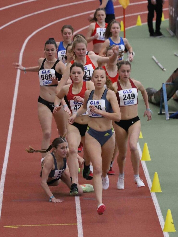 Am Samstagmorgen standen für Carolin und Lera zunächst die 1.500 m-Vorläufe auf dem Programm. Bei den 3 Vorläufen gewannen beide jeweils souverän ihren Vorlauf ohne an ihre Grenzen zu gehen und so zählten beide zum engeren Favoritenkreis. Das Finale folgte dann am Sonntagmittag. Nach dem Startschuss beobachteten beide zunächst das Renngeschehen, doch dann setze sich Carolin nach 500 m schon früh an die Spitze und kontrollierte von vorne das Feld, dich dahinter folgte dann auch Lera. Der erste Kilometer wurde in 3:11 Minuten passiert und alles lief auf eine Entscheidung auf den letzten 400 m hinaus. Kurz vor den beiden letzten Runden stürzte dann aber Lera, da ihr eine Konkurrentin von hinten in die Füße trat. In diesem Moment begann die entscheidene Phase des Rennens, da vorne das Tempo nochnals erhöht wurde. Carolin lief von der Spitze vorne weg und auf der Schlussrunde konnte ihr noch noch Emie Lotta Berger (TSV Bayer Leverkusen) folgen. Doch Carolin gab die Führung nicht mehr ab und verteidigte ihren Titel aus dem Vorjahr mit 4:34,40 Minuten erfolgreich. In 4:34,93 Minuten folgten Berger und Bronze gin an Bianca Böhnke (VfL Waiblingen). Lera konnte sich nach dem Sturz zwar schnell wieder aufrappeln und auch wieder einige Plätze gut machen, doch die Lücke ganz nach vorne konnte sie nicht mehr schließen. Sie wurde mit 4:40,99 Minuten Siebte. Bei diesem Finale sah man wie nah Erfolg und Leid zusammenliegen können. Carolin freute sich natürlich über ihren inzwischen fünften DM-Titel, doch im Ziel war sie eine der Ersten, die ihre tief enttäuschte Trainingspartnerin trösten.