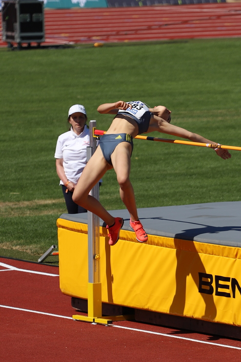Die dritte Starterin des VfL Löningen war Sophie Scheidt. Sie trat im Hochprung der U18 an und war mit ihrer persönlichen Bestleistung von 1,74 m auf Rang vier der Meldeliste. Die ersten beiden Höhen von 1,60 m und 1,64 m meisterte sie im ersten Versuch. Doch bei 1,68 m zeigten sich dann Unsicherheiten im Anlauf. In keinem ihrer drei Versuche schaffte Sophie es die 1,68 m zu überspringen und somit wurde sie ein wenig enttäuschend leider Achte. Der Nachwuchs-Bundestrainer Jan-Gerrit Keil munterte sie nach dem Wettkampf auf. Sie habe im Verlauf schon mehrfalls bewiesen, dass sie 1,70 m deutlich überspringen kann und auch noch jung sei. Nicht zu unterschätzen sei auch, dass es ihr erster Start bei ein Jugend-DM gewesen sei.
