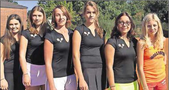 Eine Spielklasse höher aufschlagen darf die erste Tennis-Frauenmannschaft des VfL Löningen in der ab Mai startenden Freiluftsaison. Regelmäßige Teilnahme am Training und vor allem der Teamgeist bildeten den Grundstein für den Aufstieg von der Regionsklasse in die Regionsliga. Zum erfolgreichen Team gehören. Von links: Alexandra Möllmann, Katharina Neumann, Rhabea Braak, Lisa Többen, Anastasia Teplych und Felice Ostermann. Foto: Braak. Quelle: Münsterländische Tageszeitung vom 03.05.2017