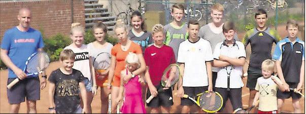 zum Bild: Aufschlag für den Nachwuchs: 14 Kinder und Jugendliche nahmen am dreitägigen Tenniscamp des VfL Löningen mit Trainer Michael Hegger teil. Foto: Hegger. Abwechslungsreiche Tage im VfL-Camp Löningen (mt) - Drei Tage lang haben jetzt 14 Kinder im Alter zwischen sieben und 14 Jahren auf Lutmatratzen in der Löninger Tennnishalle übernachtet und tagsüber bei gutem Wetter auf den Außenplätzen mit Trainer Michael Hegger das Einmaleins des Tennissports geübt. Am Abschlusstag stand schließlich die Abnahme des DTB Tennis-Sportabzeichens auf dem Programm des Tenniscamps des VfL Löningen. Doch nicht nur mit dem gelben Filzball haben sich die Teilnehmer auseinandergesetzt. Ein Besuch im Wellenfreibad, eine Nachtwanderung, ein Grill-Abend und eine Radtour zum Kegeln bei Lüdecke-Dalinghaus in Böen hatten die Veranstalter ebenfalls für die drei Tage geplant. Quelle: Münsterländische Tageszeitung vom 26.07.2017