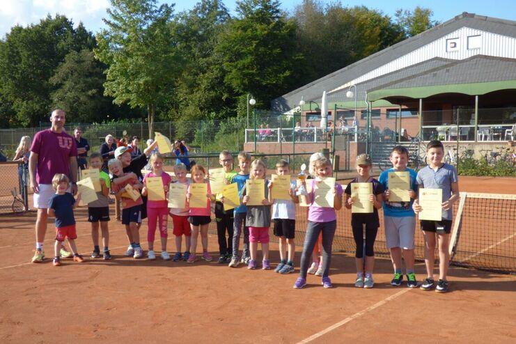 zum Bild: Teilnehmer der Kinder-Tennis-Olympiade. Vierte von rechts: die Gewinnerin Anna Morasch.