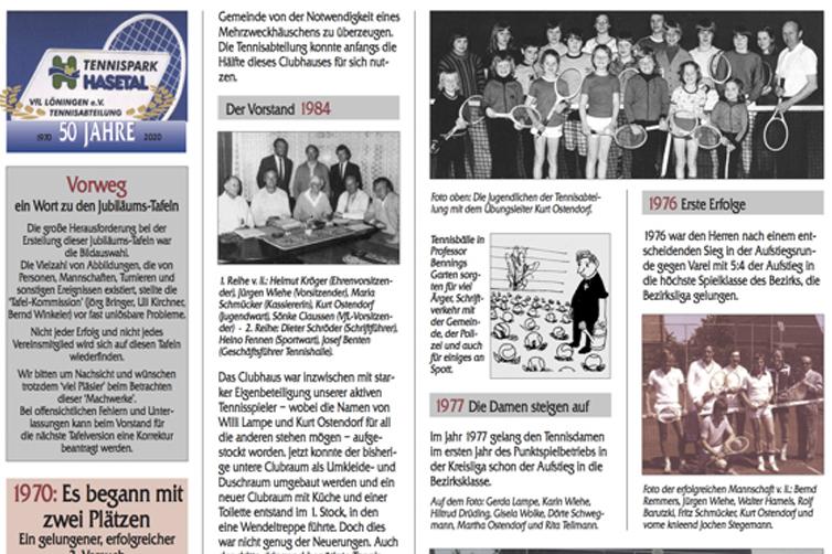 50 Jahre VfL Tennis. Das Bestellformular hängt im Clubhaus aus. Die Preise: Alle 5 Tafeln (DIN A3) = 20 Euro / Einzeltafel (DIN A3) 5 Euro. Es sind auch größere Formate bestellbar. Unter "Klick hier" könnt ihr euch die Tafeln ansehen.