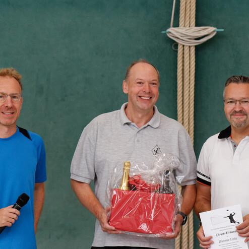 Bevor der Turniertag am Sonntag losging, hat die Volleyball-Abteilung die Gelegenheit genutzt und sich beim langjährigen Spieler, Trainer, Vorstand und Sponsor des Volleyballs in Löningen Dietmar Linke mit einem Präsent zu bedanken und aus der Vorstandsarbeit zu verabschieden.